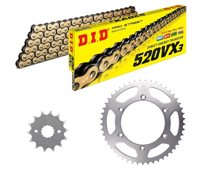 łańcuch: DID 520VX3 G&B PROFESSIONAL (X-ring super wzmocniony, [złote ogniwa zewn.]) 114 ogniw + spinka