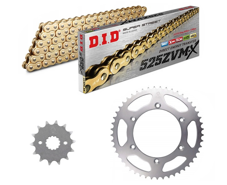 łańcuch: DID 525ZVM-X G&G (X-ring hiper wzmocniony, [złote ogniwa zewn. + wewn.]) 112 ogniw + zakuwka