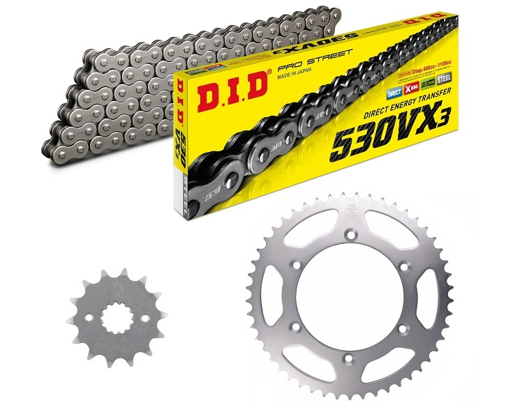 Poniższy napęd zawiera zębatki marki JT wytwarzane z japońskiej stali wysokowęglowej oraz produkowany w Japonii łańcuch marki D.I.D. Łańcuchy D.I.D to produkt najwyższej jakości. Producent – japońska firma „DAIDO KOGYO” działa na rynku już przeszło 70 lat specjalizując się w wytwarzaniu łańcuchów napędowych i rozrządu. Użytkownicy jednośladów na całym świecie, dawno przekonali się o ich niezaprzeczalnych walorach i stosują je z powodzeniem zarówno w najcięższych motocyklach drogowych, jak też w wyczynowych pojazdach sportowych, crossowych i ATV. Szeroka gama jest zróżnicowana pod względem wytrzymałości, zastosowania i ceny. Pozwala użytkownikowi dobrać produkt najbardziej odpowiadający jego wymaganiom.