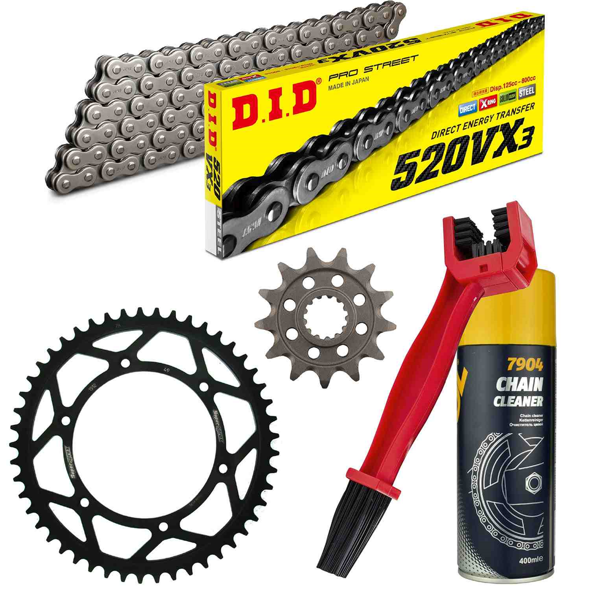 łańcuch: DID 520VX3 (X-ring super wzmocniony) 110 ogniw + spinka