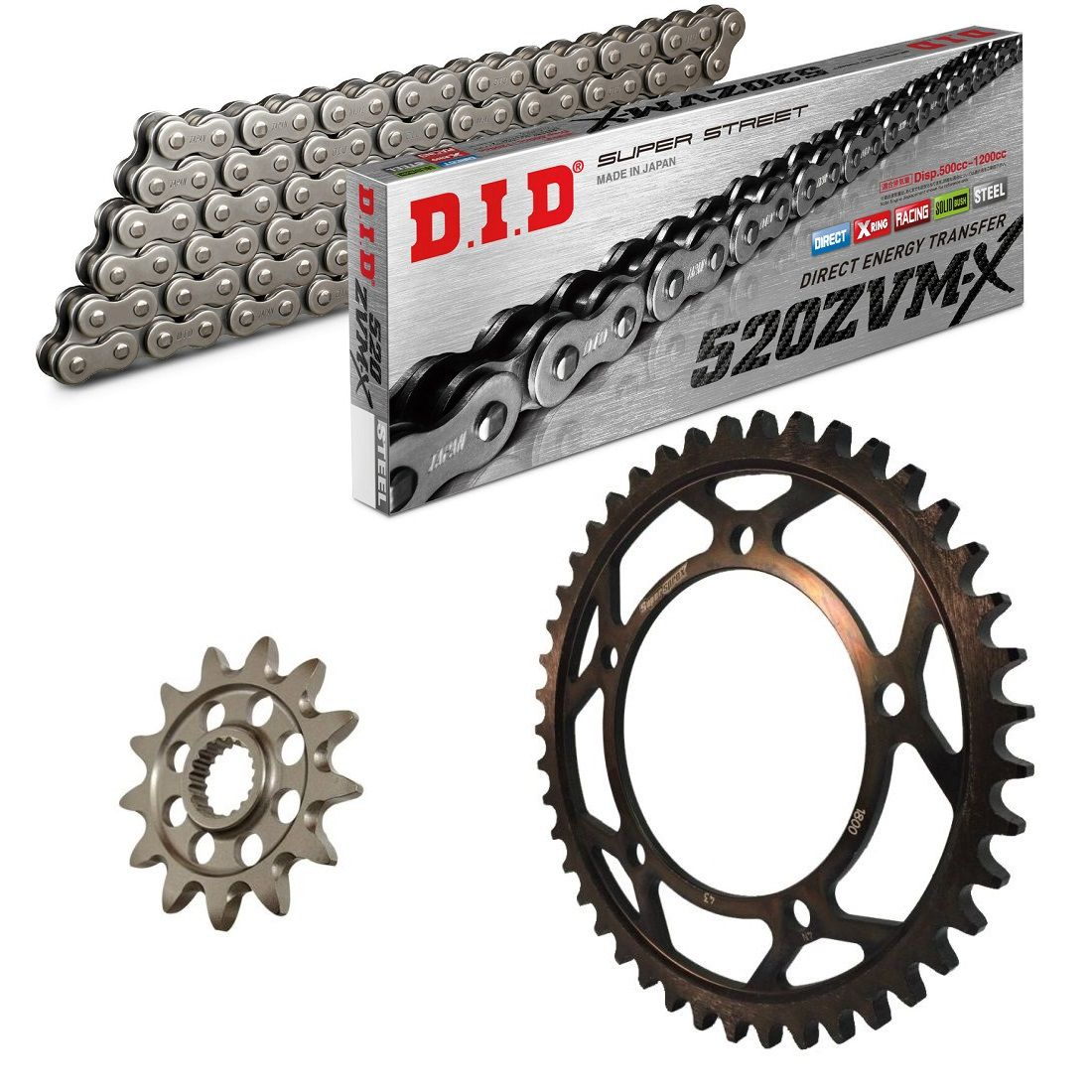 łańcuch: DID 520ZVM-X (X-ring hiper wzmocniony) 118 ogniw + zakuwka