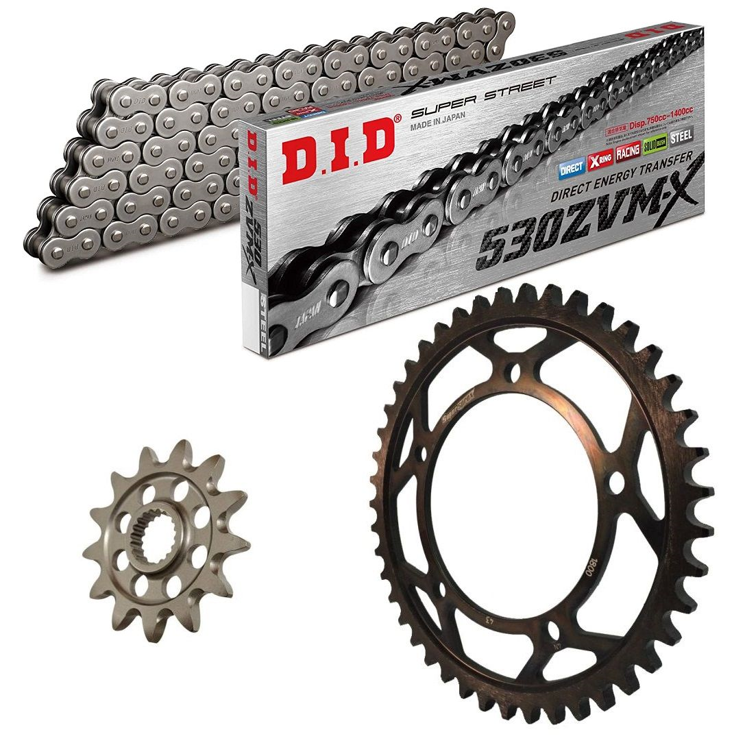 łańcuch: DID 530ZVM-X (X-ring hiper wzmocniony) 118 ogniw + zakuwka