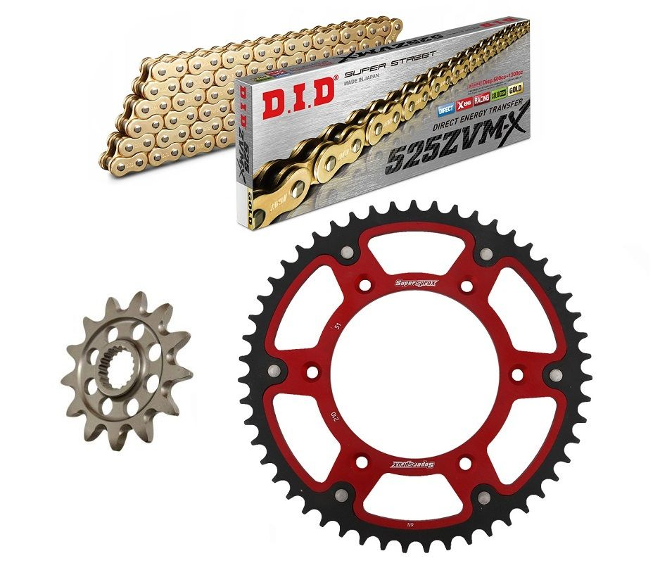 łańcuch: DID 525ZVM-X G&G (X-ring hiper wzmocniony, [złote ogniwa zewn. + wewn.]) 120 ogniw + zakuwka