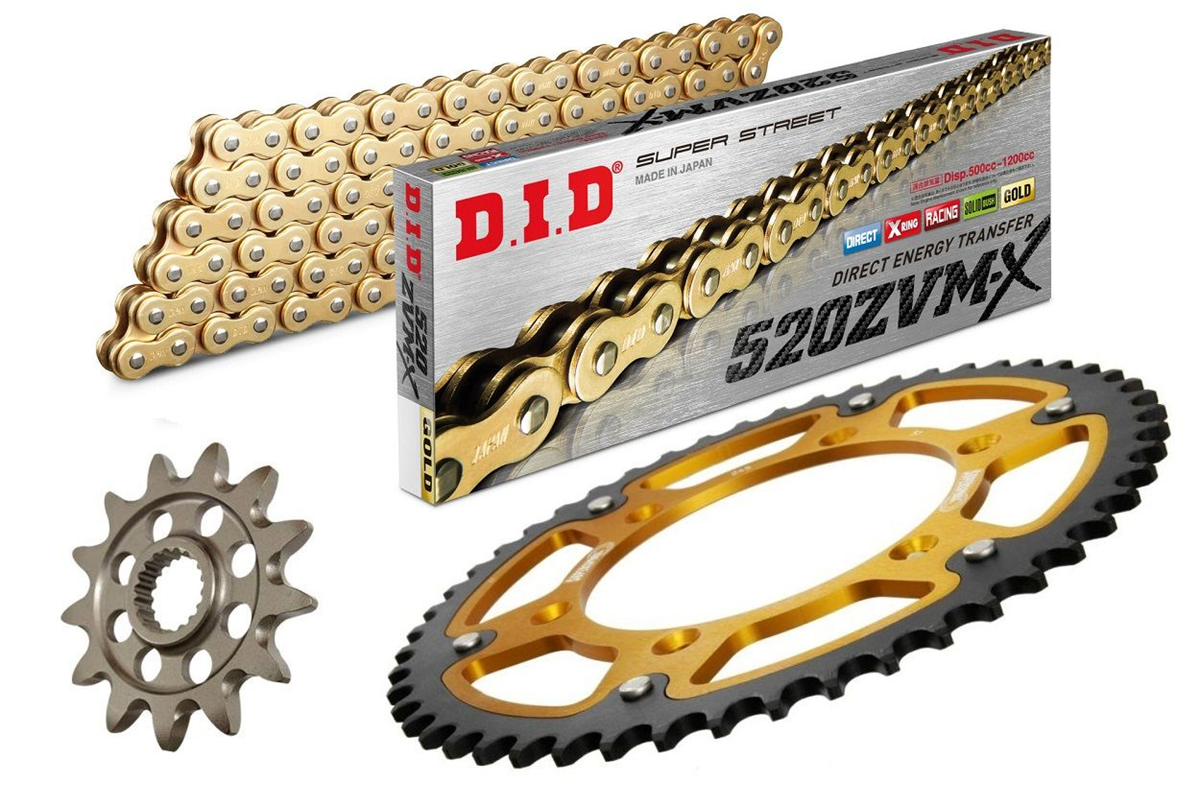 łańcuch: DID 520ZVM-X G&G (X-ring hiper wzmocniony, [złote ogniwa zewn. + wewn.]) 114 ogniw + zakuwka