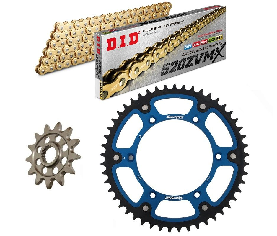 łańcuch: DID 520ZVM-X G&G (X-ring hiper wzmocniony, [złote ogniwa zewn. + wewn.]) 114 ogniw + zakuwka