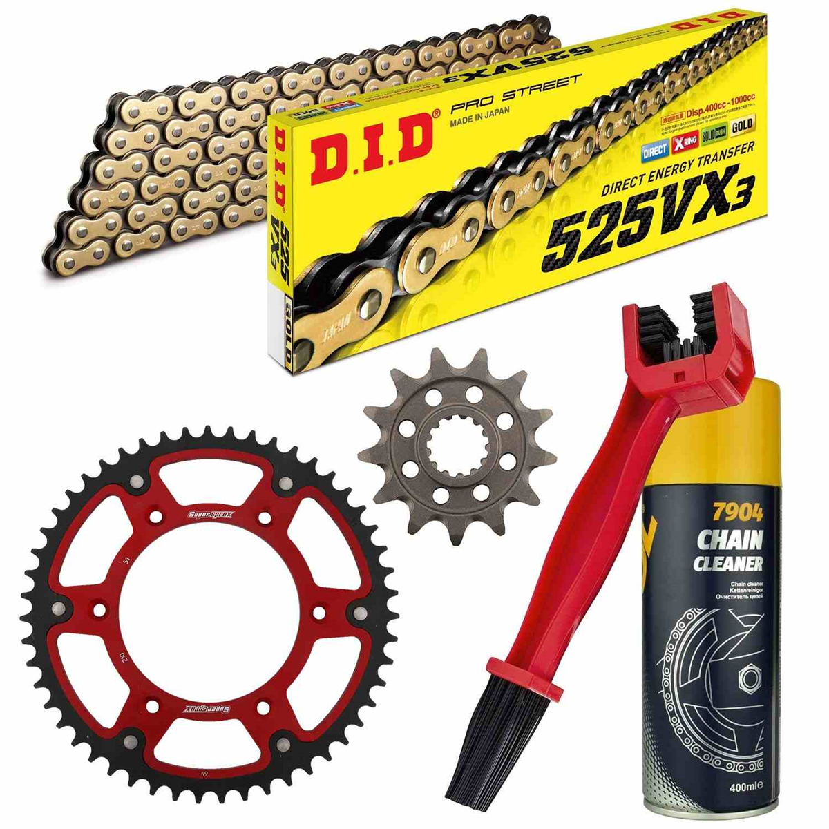 łańcuch: DID 525VX3 G&B PROFESSIONAL (X-ring wzmocniony, [złote ogniwa zewn.]) 118 ogniw + zakuwka