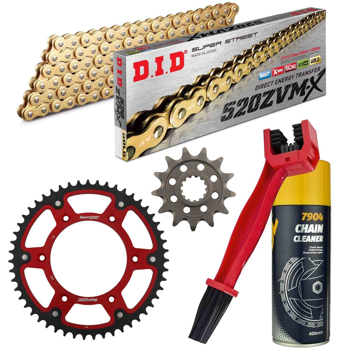 łańcuch: DID 520ZVM-X G&G (X-ring hiper wzmocniony, [złote ogniwa zewn. + wewn.]) 114 ogniw + zakuwka