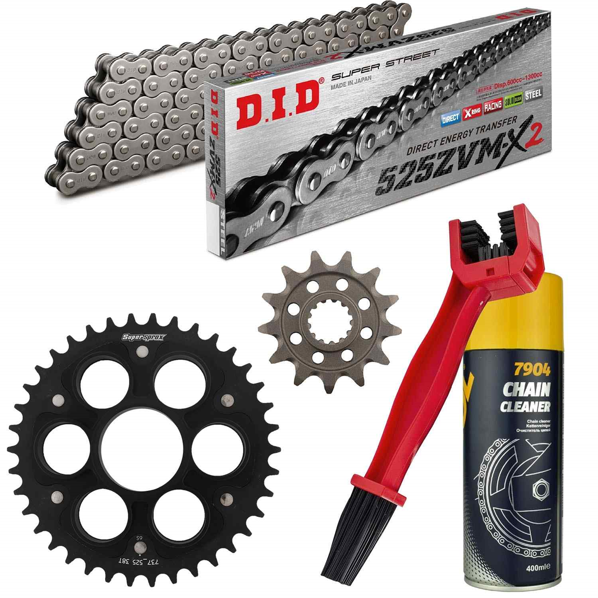 łańcuch: DID 525ZVM-X (X-ring hiper wzmocniony) 98 ogniw + zakuwka