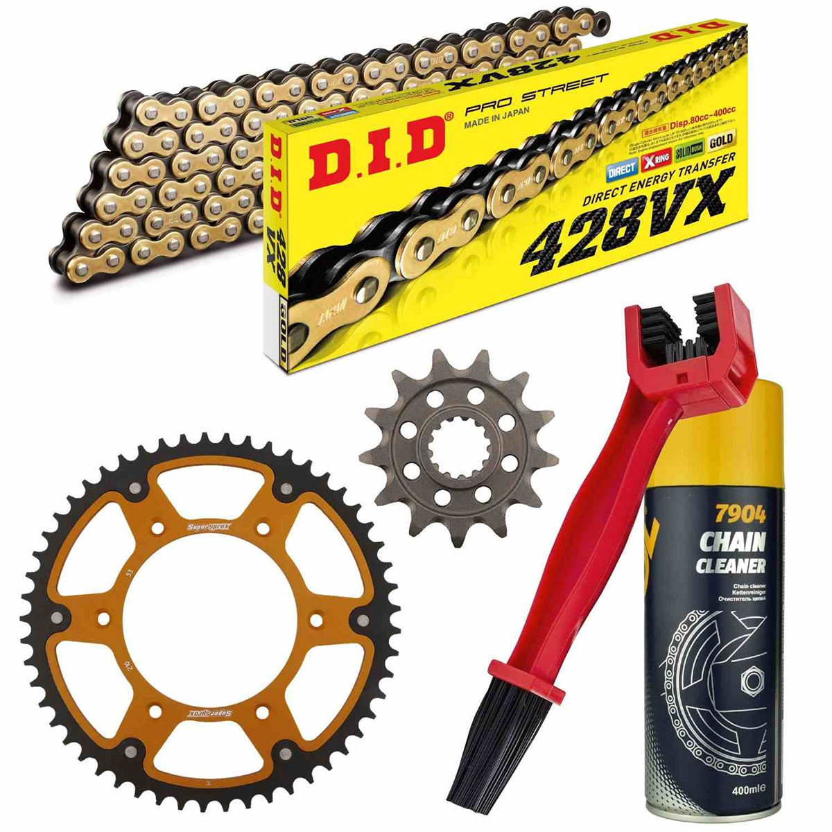 łańcuch: DID 428VX G&B PROFESSIONAL (X-ring super wzmocniony, [złote ogniwa zewn.]) 124 ogniwa + spinka