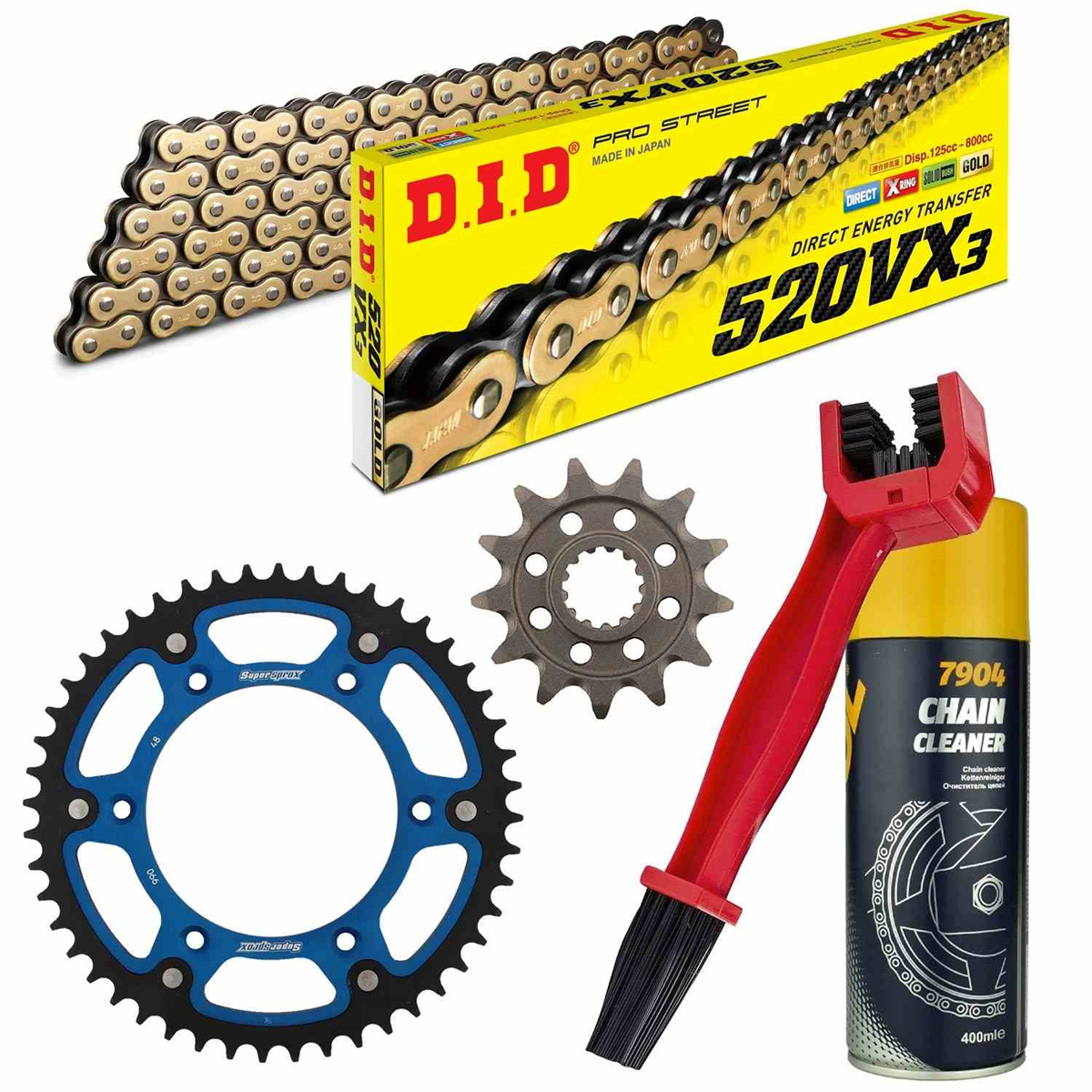 łańcuch: DID 520VX3 G&B PROFESSIONAL (X-ring wzmocniony, [złote ogniwa zewn.]) 114 ogniw + spinka