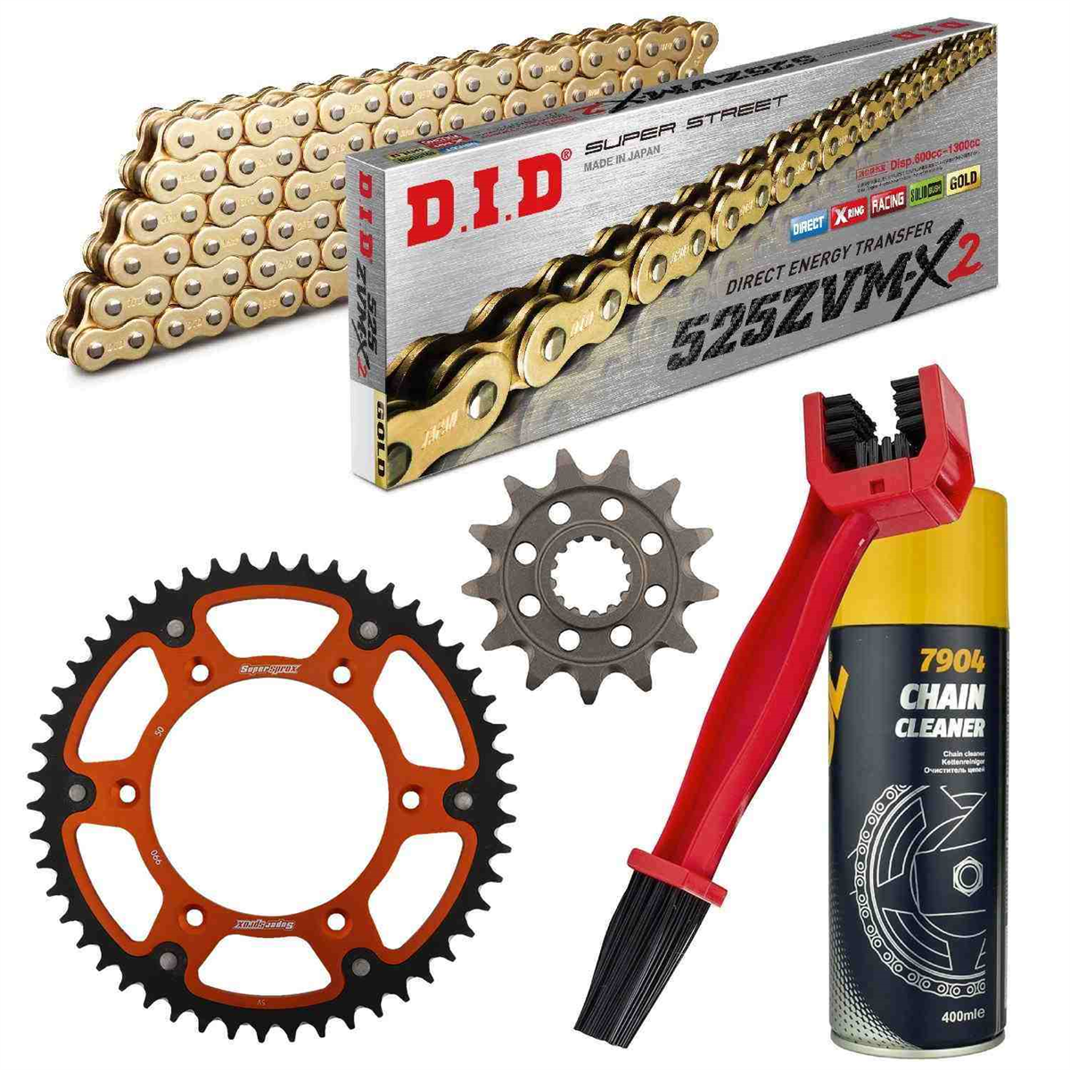 łańcuch: DID 525ZVM-X G&G (X-ring hiper wzmocniony, [złote ogniwa zewn. + wewn.]) 118 ogniw + zakuwka