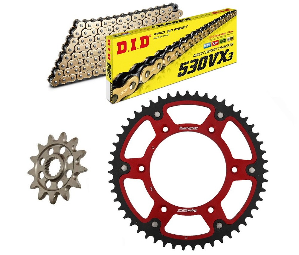 łańcuch: DID 530VX3 G&B PROFESSIONAL (X-ring wzmocniony, [złote ogniwa zewn.]) 120 ogniw + zakuwka