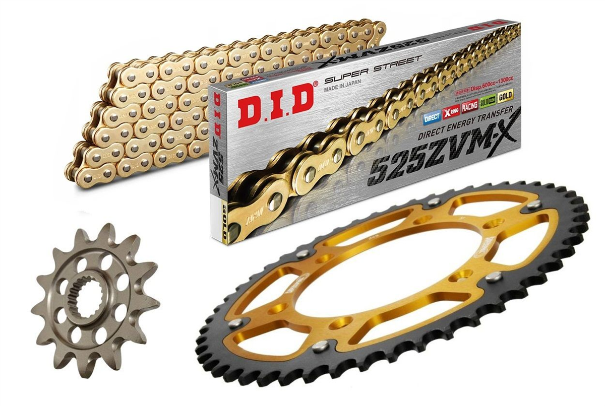 łańcuch: DID 525ZVM-X G&G (X-ring hiper wzmocniony, [złote ogniwa zewn. + wewn.]) 108 ogniw + zakuwka