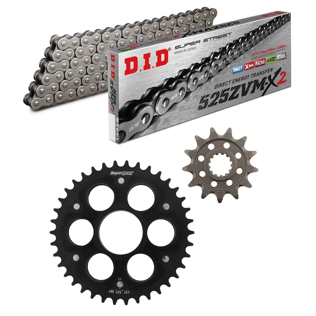 łańcuch: DID 525ZVM-X (X-ring hiper wzmocniony) 102 ogniwa + zakuwka