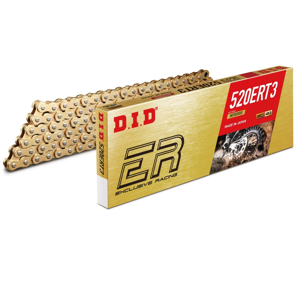Motocrosowy łańcuch stworzony specjalnie do ekstremalnych warunków w wyścigach off-road. Łańcuch DID520ERT3 ma o 25% większą skuteczność przeciwuderzeniową i 3% większą wytrzymałość na rozciąganie w stosunku do poprzedniej generacji. Zachował ten sam ciężar łańcucha, a jest mocniejszy przy zachowaniu minimalnej masy rotacyjnej.