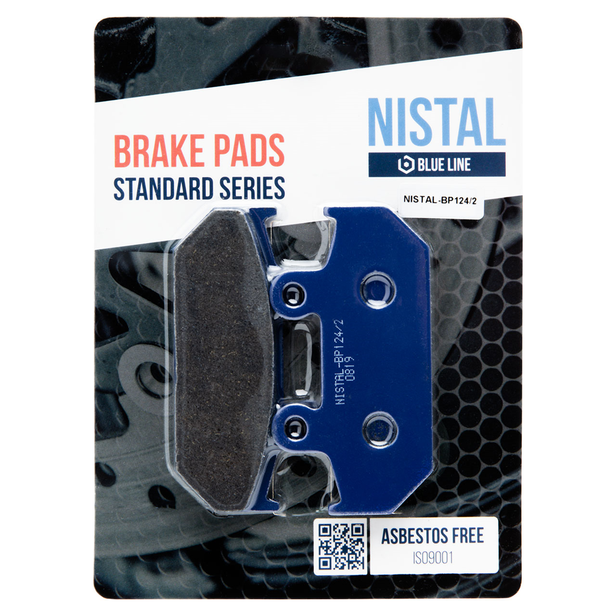 Klocki hamulcowe marki NISTAL to bezpieczny i trwały produkt posiadający doskonały stosunek jakości do ceny. Okładzina to organiczny materiał cierny wzbogacony dodatkami poprawiającymi hamowanie. Klocki z niebieskiej serii BLUE LINE dzięki zawartości 20% miedzi, zapewniają dobre odprowadzanie ciepła, nie szarpią i nie piszczą podczas hamowania. Zapewniają łagodne zużywanie się tarczy. Sprawdzą się również w cięższych motocyklach do rekreacyjnej jazdy. Wytwarzane zgodnie z certyfikatami: ISO 9001:2008, ISO 14001:2004, OHSAS 18001:2007.