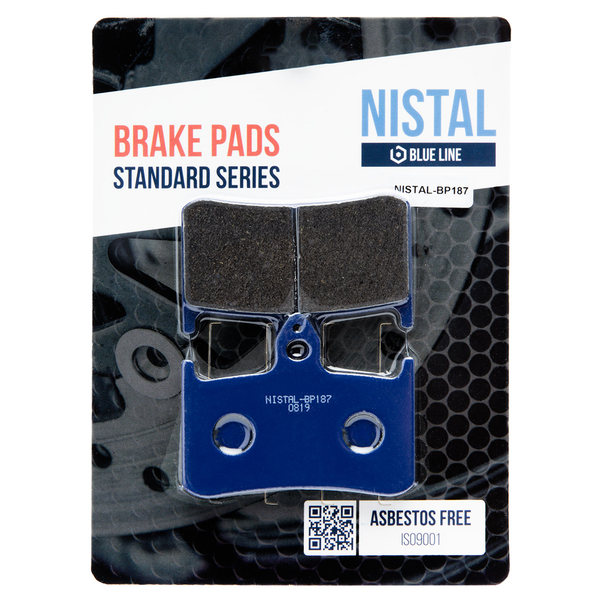 Klocki hamulcowe marki NISTAL to bezpieczny i trwały produkt posiadający doskonały stosunek jakości do ceny. Okładzina to organiczny materiał cierny wzbogacony dodatkami poprawiającymi hamowanie. Klocki z niebieskiej serii BLUE LINE dzięki zawartości 20% miedzi, zapewniają dobre odprowadzanie ciepła, nie szarpią i nie piszczą podczas hamowania. Zapewniają łagodne zużywanie się tarczy. Sprawdzą się również w cięższych motocyklach do rekreacyjnej jazdy. Wytwarzane zgodnie z certyfikatami: ISO 9001:2008, ISO 14001:2004, OHSAS 18001:2007.