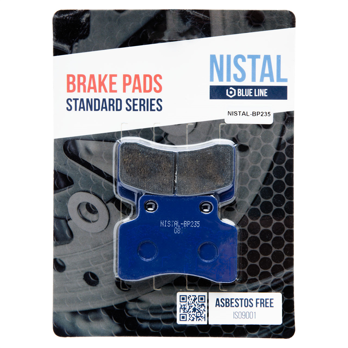 Klocki hamulcowe marki NISTAL to bezpieczny i trwały produkt posiadający doskonały stosunek jakości do ceny. Okładzina to organiczny materiał cierny wzbogacony dodatkami poprawiającymi hamowanie. Klocki z niebieskiej serii BLUE LINE dzięki zawartości 20% miedzi, zapewniają dobre odprowadzanie ciepła, nie szarpią i nie piszczą podczas hamowania. Zapewniają łagodne zużywanie się tarczy. Sprawdzą się również w cięższych motocyklach do rekreacyjnej jazdy. Wytwarzane zgodnie z certyfikatami: ISO 9001:2008, ISO 14001:2004, OHSAS 18001:2007.