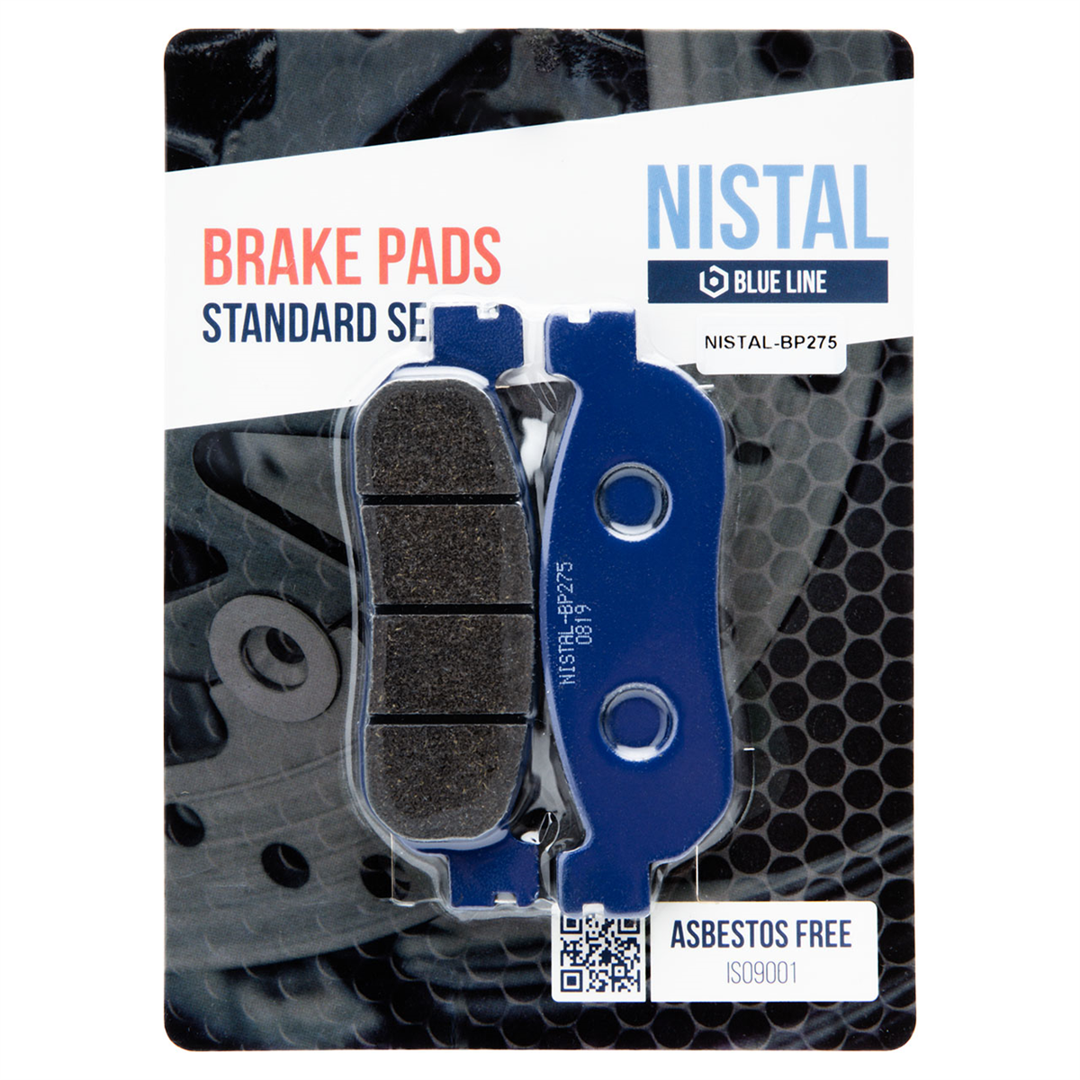 Klocki hamulcowe marki NISTAL to bezpieczny i trwały produkt posiadający doskonały stosunek jakości do ceny. Okładzina to organiczny materiał cierny wzbogacony dodatkami poprawiającymi hamowanie. Klocki z niebieskiej serii BLUE LINE dzięki zawartości 20% miedzi, zapewniają dobre odprowadzanie ciepła, nie szarpią i nie piszczą podczas hamowania. Zapewniają łagodne zużywanie się tarczy. Sprawdzą się również w cięższych motocyklach do rekreacyjnej jazdy. Wytwarzane zgodnie z certyfikatami: ISO 9001:2008, ISO 14001:2004, OHSAS 18001:2007.
