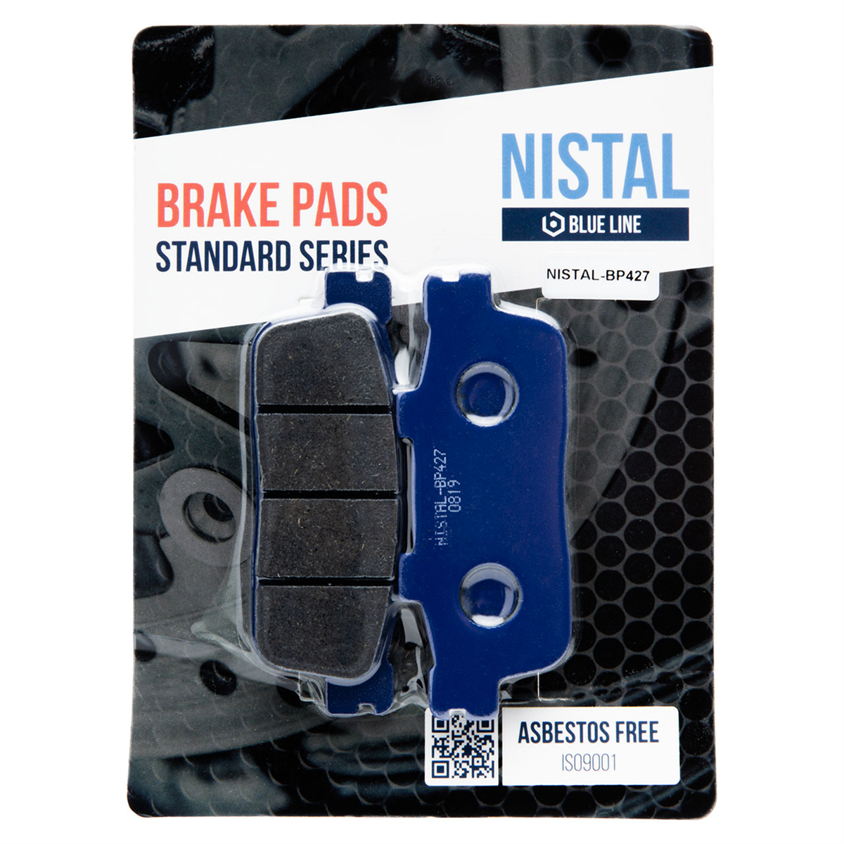 Klocki hamulcowe marki NISTAL to bezpieczny i trwały produkt posiadający doskonały stosunek jakości do ceny. Okładzina to organiczny materiał cierny wzbogacony dodatkami poprawiającymi hamowanie. Klocki z niebieskiej serii BLUE LINE dzięki zawartości 20% miedzi, zapewniają dobre odprowadzanie ciepła, nie szarpią i nie piszczą podczas hamowania. Zapewniają łagodne zużywanie się tarczy. Sprawdzą się również w cięższych motocyklach do rekreacyjnej jazdy. Wytwarzane zgodnie z certyfikatami: ISO 9001:2008, ISO 14001:2004, OHSAS 18001:2007.