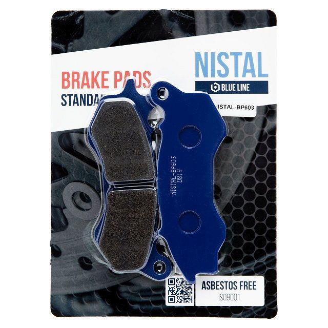 Klocki hamulcowe marki NISTAL to bezpieczny i trwały produkt posiadający doskonały stosunek jakości do ceny. Okładzina to organiczny materiał cierny wzbogacony dodatkami poprawiającymi hamowanie. Klocki z niebieskiej serii BLUE LINE dzięki zawartości 20% miedzi, zapewniają dobre odprowadzanie ciepła, nie szarpią i nie piszczą podczas hamowania. Zapewniają łagodne zużywanie się tarczy. Sprawdzą się również w cięższych motocyklach do rekreacyjnej jazdy. Wytwarzane zgodnie z certyfikatami: ISO 9001:2008, ISO 14001:2004, OHSAS 18001:2007.