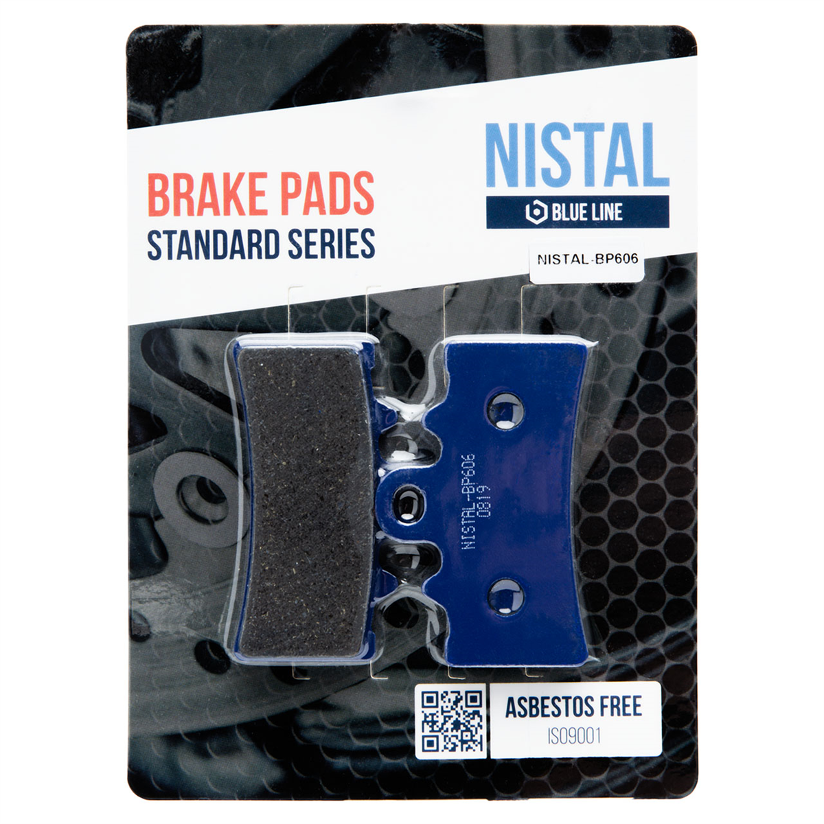 Klocki hamulcowe marki NISTAL to bezpieczny i trwały produkt posiadający doskonały stosunek jakości do ceny. Okładzina to organiczny materiał cierny wzbogacony dodatkami poprawiającymi hamowanie. Klocki z niebieskiej serii BLUE LINE dzięki zawartości 20% miedzi, zapewniają dobre odprowadzanie ciepła, nie szarpią i nie piszczą podczas hamowania. Zapewniają łagodne zużywanie się tarczy. Sprawdzą się również w cięższych motocyklach do rekreacyjnej jazdy. Wytwarzane zgodnie z certyfikatami: ISO 9001:2008, ISO 14001:2004, OHSAS 18001:2007.