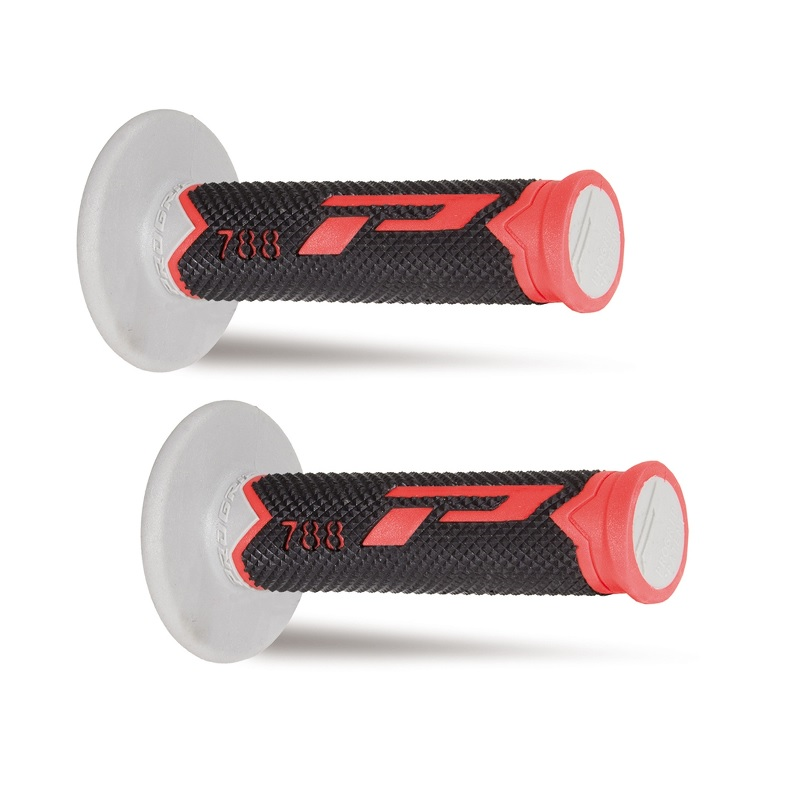 Trójskładnikowe manetki cross. Twardy materiał wewnątrz minimalizujący ruchy na kierownicy, na zewnątrz pokryty miękkim żelem, na bokach zastosowany wzmocniony materiał.