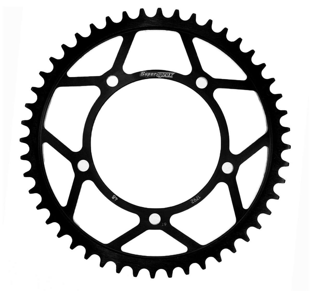 Supersprox - wyścigowe zębatki stalowe. Rozwijane na torze wyścigowym aby zapewnić wytrzymałość i wysokie osiągi. Zaprojektowane w systemie CAD i cięte CNC-laser aby zapewnić idealny montaż na kole. Wykonane ze stali SC-45 zgodnie z wysokimi normami Supersprox, pokryte unikalnym antykorozyjnym podwójnym ocynkiem (powłoka o nazwie 2XZINK) i wykończone na czarno. Wytrzymają 3 razy dłużej niż jakakolwiek aluminiowa zębatka. Jedne z najlżejszych zębatek stalowych na rynku. Dbałość o detale dotyczy także wyglądu.