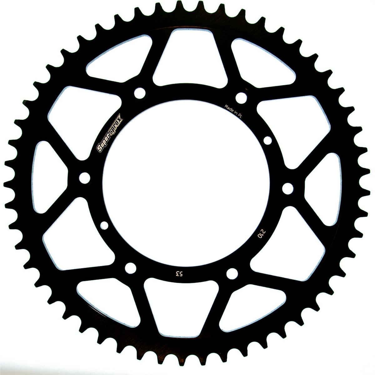 Supersprox - wyścigowe zębatki stalowe. Rozwijane na torze wyścigowym aby zapewnić wytrzymałość i wysokie osiągi. Zaprojektowane w systemie CAD i cięte CNC-laser aby zapewnić idealny montaż na kole. Wykonane ze stali SC-45 zgodnie z wysokimi normami Supersprox, pokryte unikalnym antykorozyjnym podwójnym ocynkiem (powłoka o nazwie 2XZINK) i wykończone na czarno. Wytrzymają 3 razy dłużej niż jakakolwiek aluminiowa zębatka. Jedne z najlżejszych zębatek stalowych na rynku. Dbałość o detale dotyczy także wyglądu.