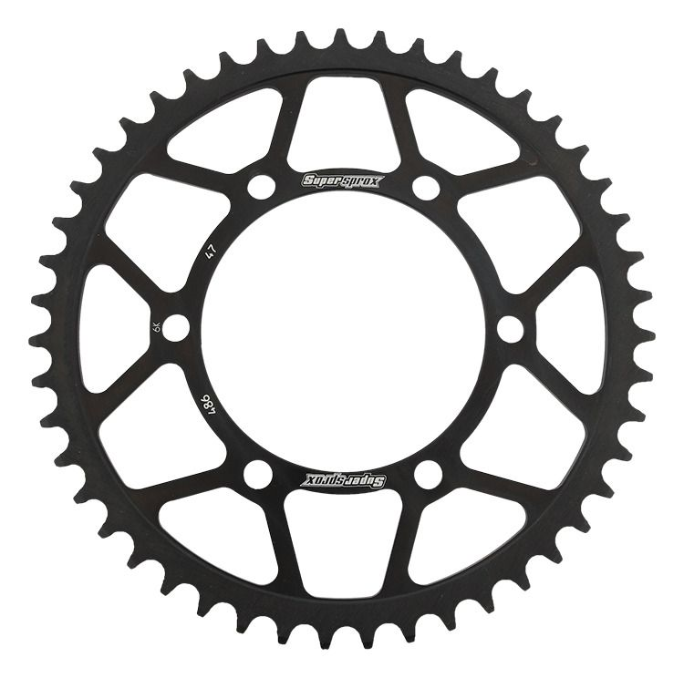 Supersprox - wyścigowe zębatki stalowe. Rozwijane na torze wyścigowym aby zapewnić wytrzymałość i wysokie osiągi. Zaprojektowane w systemie CAD i cięte CNC-laser aby zapewnić idealny montaż na kole. Wykonane ze stali SC-45 zgodnie z wysokimi normami Supersprox, pokryte unikalnym antykorozyjnym podwójnym ocynkiem (powłoka o nazwie 2XZINK) i wykończone na czarno. Wytrzymają 3 razy dłużej niż jakakolwiek aluminiowa zębatka. Jedne z najlżejszych zębatek stalowych na rynku. Dbałość o detale dotyczy także wyglądu.