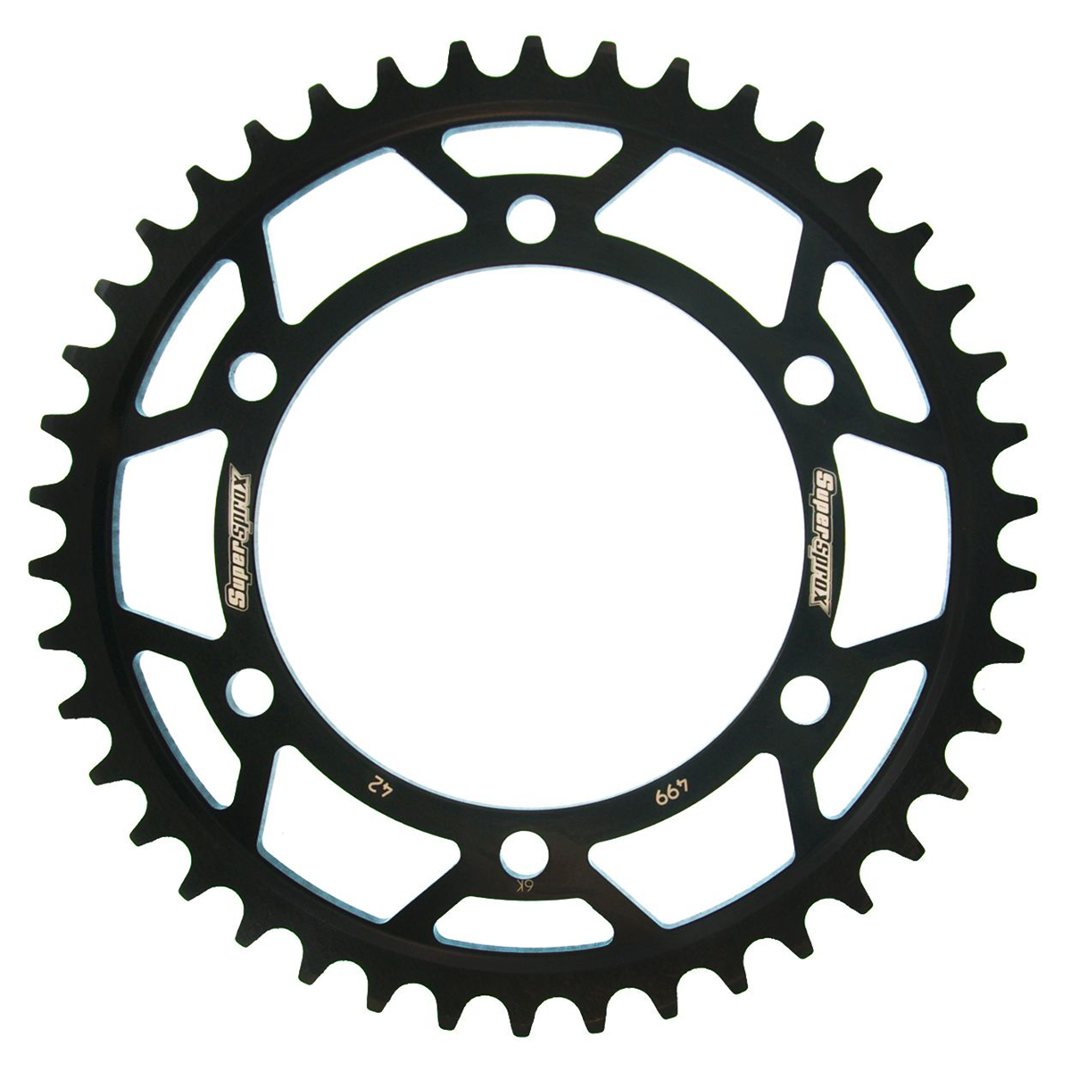 Supersprox - wyścigowe zębatki stalowe. Rozwijane na torze wyścigowym aby zapewnić wytrzymałość i wysokie osiągi. Zaprojektowane w systemie CAD i cięte CNC-laser aby zapewnić idealny montaż na kole. Wykonane ze stali SC-45 zgodnie z wysokimi normami Supersprox, pokryte unikalnym antykorozyjnym podwójnym ocynkiem (powłoka o nazwie 2XZINK) i wykończone na czarno. Wytrzymają 3 razy dłużej niż jakakolwiek aluminiowa zębatka. Jedne z najlżejszych zębatek stalowych na rynku. Dbałość o detale dotyczy także wyglądu.