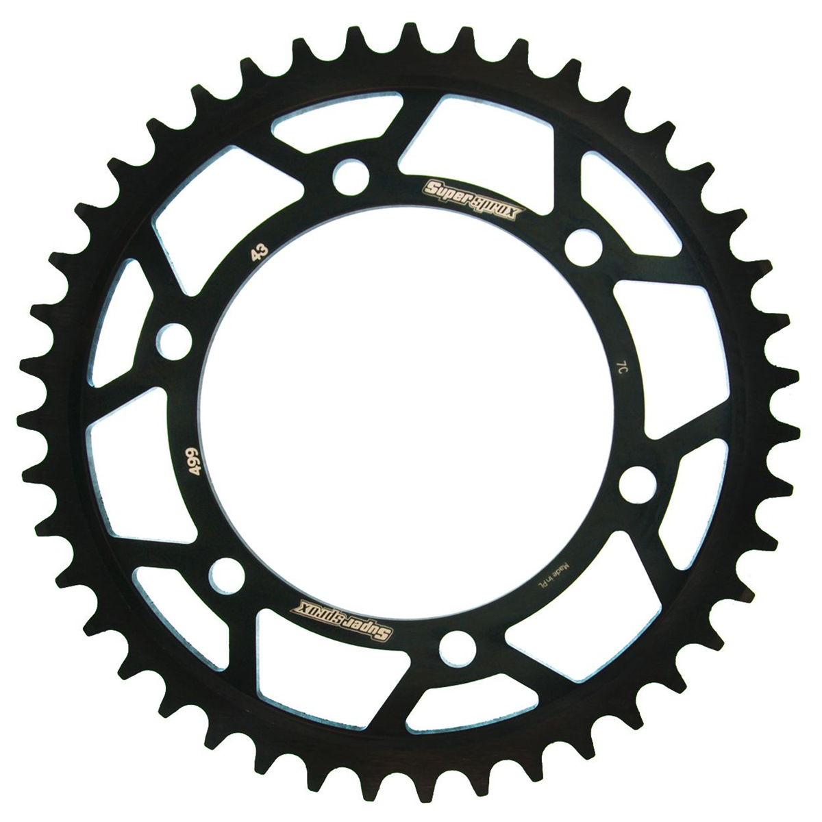 Supersprox - wyścigowe zębatki stalowe. Rozwijane na torze wyścigowym aby zapewnić wytrzymałość i wysokie osiągi. Zaprojektowane w systemie CAD i cięte CNC-laser aby zapewnić idealny montaż na kole. Wykonane ze stali SC-45 zgodnie z wysokimi normami Supersprox, pokryte unikalnym antykorozyjnym podwójnym ocynkiem (powłoka o nazwie 2XZINK) i wykończone na czarno. Wytrzymają 3 razy dłużej niż jakakolwiek aluminiowa zębatka. Jedne z najlżejszych zębatek stalowych na rynku. Dbałość o detale dotyczy także wyglądu.