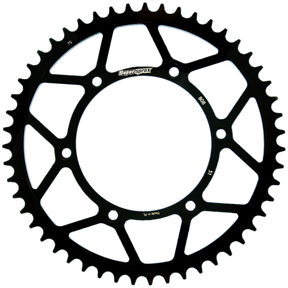 Supersprox - wyścigowe zębatki stalowe. Rozwijane na torze wyścigowym aby zapewnić wytrzymałość i wysokie osiągi. Zaprojektowane w systemie CAD i cięte CNC-laser aby zapewnić idealny montaż na kole. Wykonane ze stali SC-45 zgodnie z wysokimi normami Supersprox, pokryte unikalnym antykorozyjnym podwójnym ocynkiem (powłoka o nazwie 2XZINK) i wykończone na czarno. Wytrzymają 3 razy dłużej niż jakakolwiek aluminiowa zębatka. Jedne z najlżejszych zębatek stalowych na rynku. Dbałość o detale dotyczy także wyglądu.
