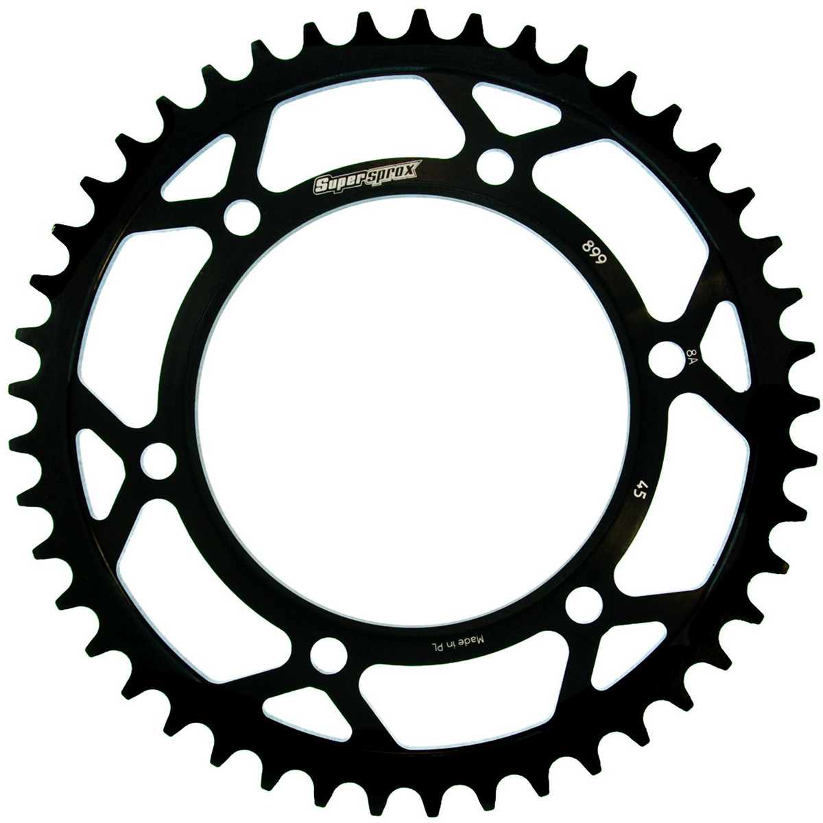 Supersprox - wyścigowe zębatki stalowe. Rozwijane na torze wyścigowym aby zapewnić wytrzymałość i wysokie osiągi. Zaprojektowane w systemie CAD i cięte CNC-laser aby zapewnić idealny montaż na kole. Wykonane ze stali SC-45 zgodnie z wysokimi normami Supersprox, pokryte unikalnym antykorozyjnym podwójnym ocynkiem (powłoka o nazwie 2XZINK) i wykończone na czarno. Wytrzymają 3 razy dłużej niż jakakolwiek aluminiowa zębatka. Jedne z najlżejszych zębatek stalowych na rynku. Dbałość o detale dotyczy także wyglądu.