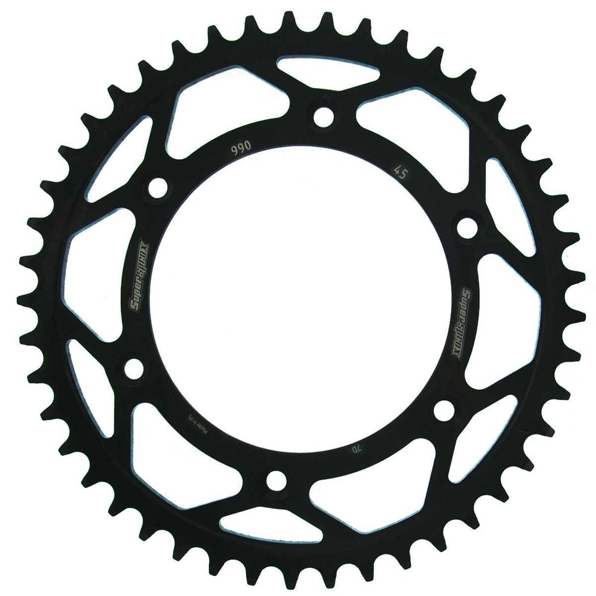 Supersprox - wyścigowe zębatki stalowe. Rozwijane na torze wyścigowym aby zapewnić wytrzymałość i wysokie osiągi. Zaprojektowane w systemie CAD i cięte CNC-laser aby zapewnić idealny montaż na kole. Wykonane ze stali SC-45 zgodnie z wysokimi normami Supersprox, pokryte unikalnym antykorozyjnym podwójnym ocynkiem (powłoka o nazwie 2XZINK) i wykończone na czarno. Wytrzymają 3 razy dłużej niż jakakolwiek aluminiowa zębatka. Jedne z najlżejszych zębatek stalowych na rynku. Dbałość o detale dotyczy także wyglądu.