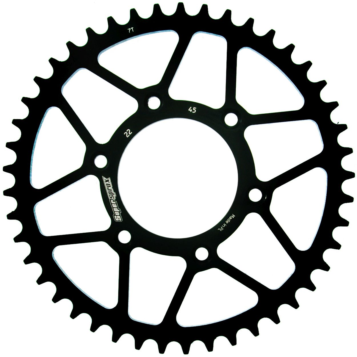 Supersprox - wyścigowe zębatki stalowe. Rozwijane na torze wyścigowym aby zapewnić wytrzymałość i wysokie osiągi. Zaprojektowane w systemie CAD i cięte CNC-laser aby zapewnić idealny montaż na kole. Wykonane ze stali SC-45 zgodnie z wysokimi normami Supersprox, pokryte unikalnym antykorozyjnym podwójnym ocynkiem (powłoka o nazwie 2XZINK) i wykończone na czarno. Wytrzymają 3 razy dłużej niż jakakolwiek aluminiowa zębatka. Jedne z najlżejszych zębatek stalowych na rynku. Dbałość o detale dotyczy także wyglądu.