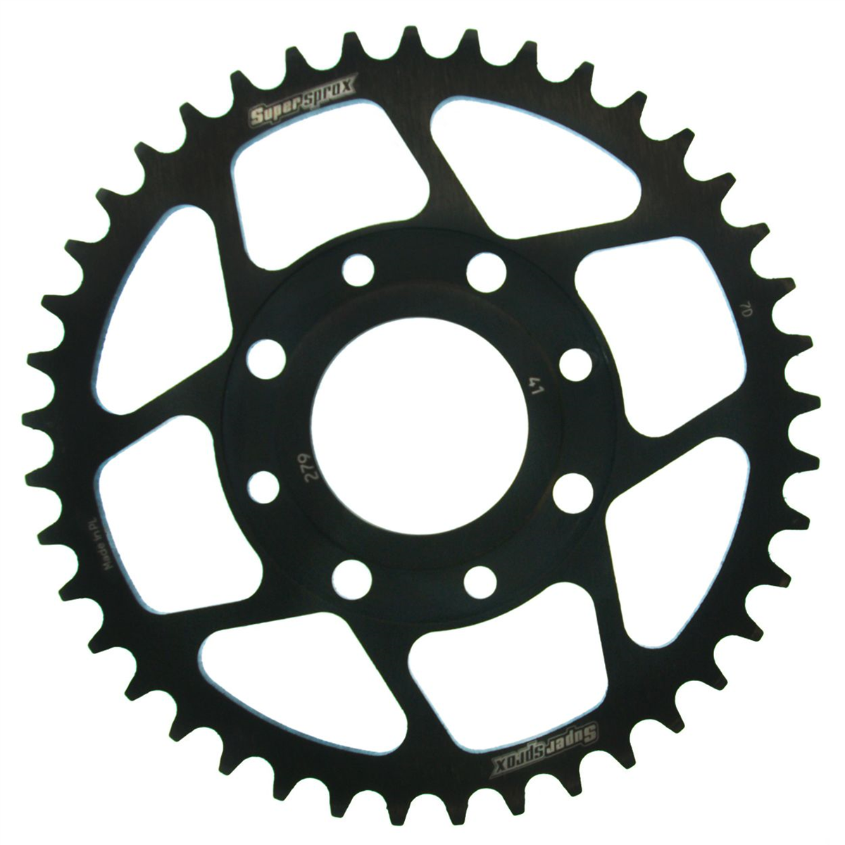 Supersprox - wyścigowe zębatki stalowe. Rozwijane na torze wyścigowym aby zapewnić wytrzymałość i wysokie osiągi. Zaprojektowane w systemie CAD i cięte CNC-laser aby zapewnić idealny montaż na kole. Wykonane ze stali SC-45 zgodnie z wysokimi normami Supersprox, pokryte unikalnym antykorozyjnym podwójnym ocynkiem (powłoka o nazwie 2XZINK) i wykończone na czarno. Wytrzymają 3 razy dłużej niż jakakolwiek aluminiowa zębatka. Jedne z najlżejszych zębatek stalowych na rynku. Dbałość o detale dotyczy także wyglądu.