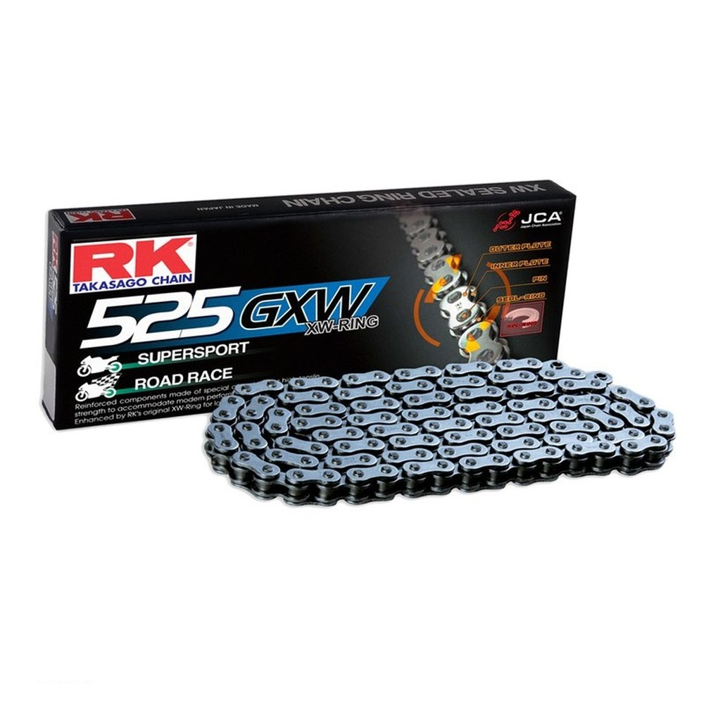 Łańcuchy RK typu GXW to topowa linia łańcuchów napędowych odpornych na maksymalne przeciążenia. XW-ringowe łańcuchy to najlepsze z aktualnie dostępnych na rynku. Odporne na wysokie prędkości, temperatury i przeciążenia. Dzięki zastosowaniu topowego uszczelnienia typu XW-ring wykonanego z zaawansowanego kompozytu gwarantującego idealne uszczelnienie dzięki trzem punktom uszczelniającym i dwóm stabilizatorom (zewnętrzny i wewnętrzny) łańcuch jest maksymalnie odporny na zużycie. Trzy sekcje smarowe stworzone dzięki uszczelnieniu XW-ring gwarantują idealną ochronę łańcucha przed zanieczyszczeniami, korozją, temperaturą i gwarantują utrzymanie smaru wewnątrz nawet podczas najbardziej ekstremalnego obciążenia. Łańcuchy GXW gwarantują 10 krotnie większą odporność na zużycie w porównaniu ze standardowym łańcuchem O-ringowym.