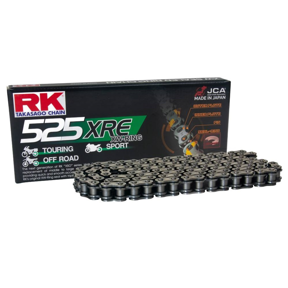 Łańcuchy serii XRE są przeznaczone do stosowania w motocyklach szosowych. Zastosowano tutaj uszczelnienia XW-ring, te same, co w najmocniejszych łańcuchach napędowych RK. XW-ring gwarantuje dużo lepszą ochronę przed destrukcyjnym działaniem wilgoci, wydłużając czas użytkowania łańcucha o kolejne kilkanaście procent. Dla motocyklistów istotne są również opory. XW-ring charakteryzuje się niskim współczynnikiem tarcia co powoduje, że łańcuch z takim uszczelnieniem staje się atrakcyjny również dla użytkowników motocykli enduro.