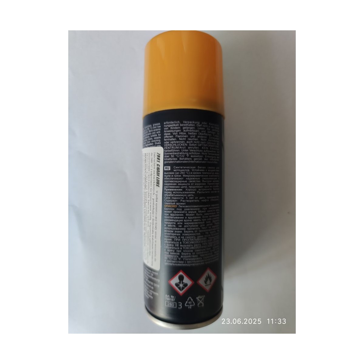 Syntetyczny smar w aerozolu do łańcuchów motocyklowych. Posiada stabilność termiczną do 260°C i jest odporny na wymywanie wodą.